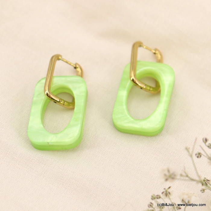 Bi&Jou, grossiste bijoux pas cher à Paris dans la rue du temple, vous propose ces boucles d'oreilles de style géométrique en résine effet marbré et acier doré 0323048. Les dimensions de ces boucles d'oreilles effet vintage chic sont de 20x45mm. Ces boucles d'oreilles élégantes se fixent à l'oreille par un fermoir cliquet. Bi&Jou, fournisseur français pour les professionnels de la mode et de la beauté, vous informe que ces boucles d'oreilles en résine marbrée ne contiennent pas de nickel, plomb ni cadmium et sont anti-allergiques (conformément aux lois françaises et européennes).