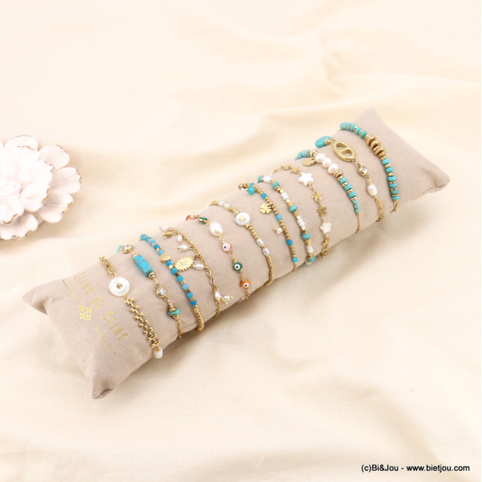 Bi&Jou, créateur et grossiste bijoux acier à Paris dans la rue du temple, vous propose cet ensemble de 12 bracelets en acier inoxydable avec fleur, coeur, trèfle, étoile, oeil, perle d'eau douce, pierre, nacre naturelle, strass et son boudin de présentation fourni pour femme 0223087. La longueur des bracelets en acier inoxydable est réglable grâce à une chaînette d'extension et son fermoir mousqueton. Bi&jou Paris vous informe que certains bracelets fantaisie sont composés de pierre ou de nacre naturelle : Leur forme, couleur et taille peuvent varier. BietJou Paris, fournisseur français pour les professionnels de la mode et de la beauté, vous informe que ces boucles d'oreilles en acier ne contiennent pas de nickel, plomb ni cadmium et sont anti-allergiques (conformément aux lois françaises et européennes).