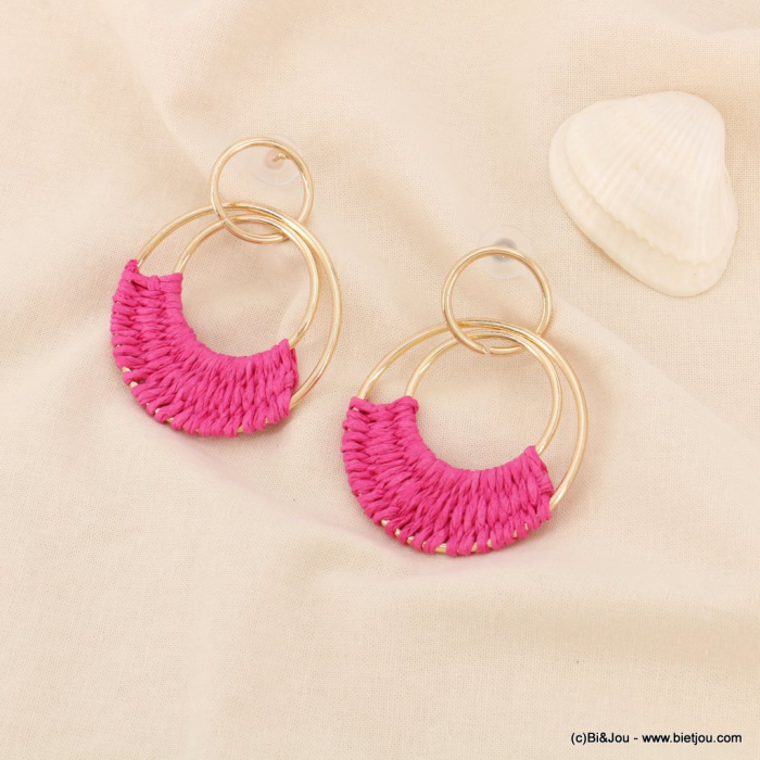 Bi&Jou, créateur-grossiste bijoux acier à Paris dans la rue du temple, vous propose ces boucles d'oreilles pendantes oversize, anneau avec tressage papier coloré 0323208. Les dimensions de ces boucles d'oreilles plage sont de 45x59mm. Ces boucles d'oreilles hippie-chic se fixent à l'oreille par un fermoir à coussinet. Bi&Jou, fournisseur français pour les professionnels de la mode et de la beauté, vous informe que ces boucles d'oreilles pendantes colorées en métal et papier ne contiennent pas de nickel, plomb ni cadmium et sont anti-allergiques (conformément aux lois françaises et européennes).