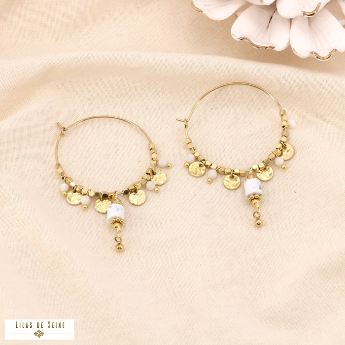 Bi&Jou, grossiste-créateur français de bijoux tendances en acier à Paris dans la rue du temple, vous propose ces boucles d'oreilles créoles en acier inoxydable avec des billes et des rondelles en pierre naturelle 0324068. Les dimensions sont d’environ L35xH60mm. Ces boucles d'oreilles se fixent à l'oreille percée par un fermoir hoop. Votre grossiste vous informe que ce bijou est composé de pierre naturelle : La forme, couleur et taille peuvent varier. Votre vendeur en gros vous informe que les couleurs disponibles pour la pierre sont le beige/naturel, le blanc nacré, le rose nude et le vert aqua. BietJou Paris, votre fournisseur français pour les revendeurs professionnels de la mode (bijouteries, boutiques de prêt-à-porter, concept-stores, ) et de la beauté (salons de coiffure, instituts de beauté, ongleries,...), vous informe que ce bijou acier ne contient pas de nickel, plomb ni cadmium et est anti-allergique (conformément aux lois françaises et européennes).