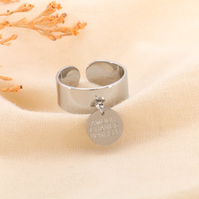 Bi&Jou, grossiste-créateur français de bijoux tendances en acier à Paris dans la rue du temple, vous propose cette bague large en acier inoxydable avec breloque message "AMOUR CHANCE BONHEUR" pour femme 0424047. L'anneau de cette bague en acier est ouvert et légèrement réglable par simple pression. Largeur de cette bague est de 8mm. Le diamètre de l’anneau est de 17mm environ. Votre vendeur en gros vous informe que les couleurs disponibles sont le doré et l’argenté. BietJou Paris, votre fournisseur français pour les revendeurs professionnels de la mode (bijouteries, boutiques de prêt-à-porter, concept-stores, ) et de la beauté (salons de coiffure, instituts de beauté, ongleries,...), vous informe que ce bijou acier ne contient pas de nickel, plomb ni cadmium et est anti-allergique (conformément aux lois françaises et européennes).