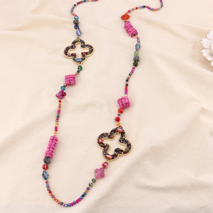 Bi&Jou, créateur et grossiste bijoux fantaisie à Paris dans la rue du temple, vous propose ce sautoir long chaîne avec trèfles, en cristal, strass, pierre, polyester, métal pour femme 0124528. La longueur déployée de ce collier est d’environ 102cm. Ce sautoir s'enfile facilement autour du cou. BietJou Paris, fournisseur français pour les professionnels de la mode et de la beauté, vous informe que ce sautoir pendentif maxi croix baroque, idéal porté avec un manteau en laine, ne contient pas de nickel, plomb ni cadmium et est anti-allergique (conformément aux lois françaises et européennes).