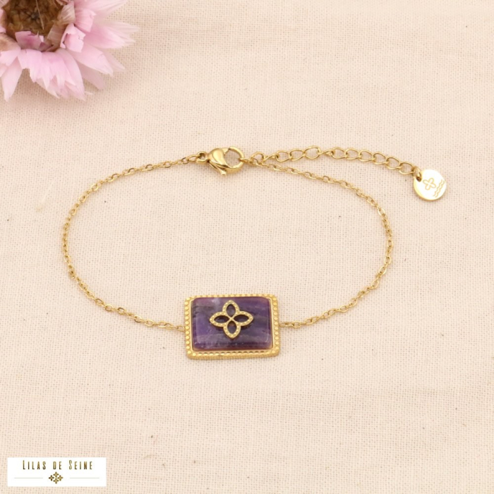 Bi&Jou, votre meilleur grossiste-créateur français de bijoux tendances en acier à Paris dans la rue du temple, vous propose ce bracelet en acier inoxydable avec une pierre naturelle rectangulaire surmontée d’un trèfle à 4 feuilles ainsi qu'une fine chaîne en maille forçat 0224008. Ce bracelet fera la parure idéale avec le collier 0124013, les boucles d’oreilles 0324028 et la bague 0424001 assortis pour composer un élégant coffret cadeau. Les dimensions de la pierre sont d’environ L15xH12mm. La longueur déployée de ce bracelet est d’environ 16cm. Elle est réglable grâce à une chaînette d'extension de 3cm environ et son fermoir mousqueton. Votre vendeur en gros vous informe que ce bijou fantaisie est composé de pierre naturelle : la forme, couleur et taille peuvent légèrement varier. BietJou Paris, votre fournisseur français pour les revendeurs professionnels de la mode (bijouteries, boutiques de prêt-à-porter, concept-stores, ) et de la beauté (salons de coiffure, instituts de beauté, ongleries,...), vous informe que ce bijou acier ne contient pas de nickel, plomb ni cadmium et est anti-allergique (conformément aux lois françaises et européennes). Les couleurs disponibles pour la pierre sont le noir, le vert, l’orange et le violet.