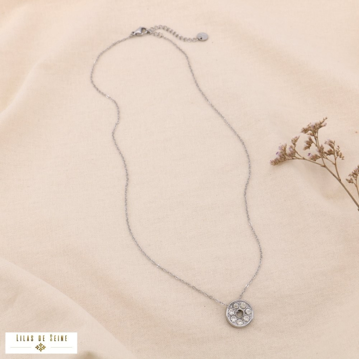 Bi&Jou, votre meilleur grossiste-créateur français de bijoux tendances en acier à Paris dans la rue du temple pour les revendeurs, vous propose ce collier constitué d'un pendentif rond, serti de petits strass disposés en cercle, ainsi qu’une fine chaîne de maille forçat pour femme 0124555. La longueur déployée de ce collier est d’environ 38 cm. La longueur de ce collier en acier est réglable grâce à une chaînette d'extension et son fermoir mousqueton. Ce collier forme la parure idéale avec le bracelet 0224574 et les boucles d'oreilles 0324577 assortis pour composer un coffret cadeau. BietJou Paris, votre fournisseur français pour les professionnels de la mode (bijouteries, boutiques de prêt-à-porter, concept-stores, ) et de la beauté (salons de coiffure, instituts de beauté, ongleries,...), vous informe que ce bijou fantaisie ne contient pas de nickel, plomb ni cadmium et est anti-allergique (conformément aux lois françaises et européennes). Votre vendeur en gros vous indique que les couleurs disponibles sont l’argenté et le doré.