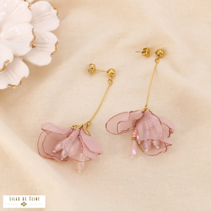 Bi&Jou, votre meilleur grossiste bijoux tendances en acier inoxydable à Paris dans la rue du temple, vous propose ces boucles d'oreilles florales au design délicat et poétique, en acier, mousseline, perle rocaille et cristal pour femme 0325037. Chaque boucle est composée d’une tige fine dorée suspendue à un fermoir boule, apportant un effet aérien et élégant. L’élément central est une fleur en tissu mousseline translucide, dont les pétales superposés créent un effet de volume et de légèreté. Les contours des pétales sont finement bordés, ajoutant un détail subtil et raffiné. De petites perles en cristal sont disposées au cœur de chaque fleur, accentuant son charme naturel. Les dimensions sont de 25x68mm. Ces boucles d'oreilles en acier se fixent grâce leur fermoir papillon. BietJou Paris, votre fournisseur français pour les revendeurs professionnels de la mode (bijouteries, boutiques de prêt-à-porter, concept-stores, ) et de la beauté (salons de coiffure, instituts de beauté, ongleries,...), vous informe que ce bijou acier ne contient pas de nickel, plomb ni cadmium et est anti-allergique (conformément aux lois françaises et européennes).