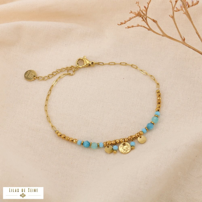 - Pierres naturelles authentiques : Rondelles de pierres aux nuances pastel, sublimées par des perles dorées pour un effet lumineux et raffiné.