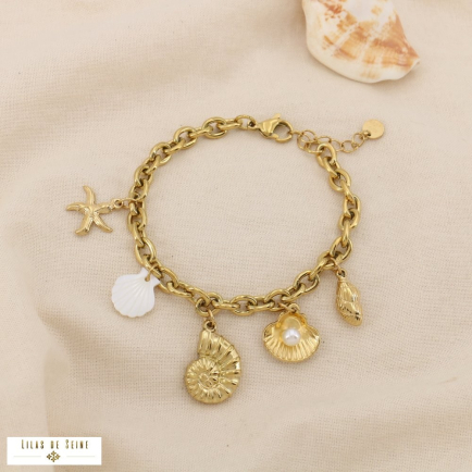 Ce bracelet en acier inoxydable doré revisite l’esprit bord de mer avec élégance et originalité. Composé d’une chaîne à maillons ronds et de cinq pendentifs marins – étoile de mer, coquillages texturés, style ammonite dorée, nacre blanche et perle acrylique – il offre un équilibre parfait entre esprit vacances et raffinement.