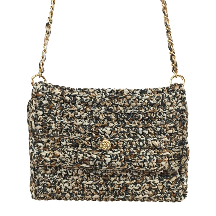 Alliant élégance décontractée et fabrication soignée, ce sac à bandoulière tressé en polyester est une pièce phare pour enrichir l'offre maroquinerie de vos boutiques de mode et concept-stores. Conçu dans une matière souple et résistante, ce modèle séduit par son effet tressé et sa chaîne dorée entrelacée de tissu, apportant une touche de raffinement subtile.