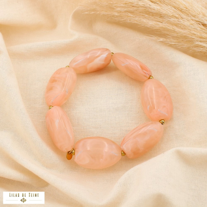 Ce bracelet élastique en acier inoxydable et résine séduit par ses perles ovales généreuses (31 x 21 x 21 mm environ) et son design à la fois doux et structuré. Chaque perle, marbrée avec subtilité, évoque l’élégance naturelle de la pierre tout en conservant la légèreté de la résine. Facile à enfiler grâce à son fil élastique, il s’adapte confortablement à tous les poignets sans compromettre le style.