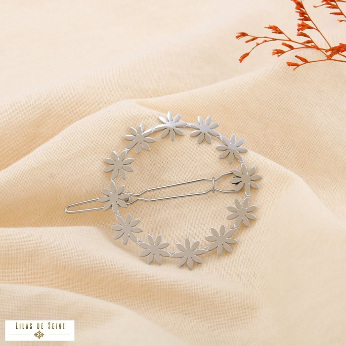 Disponible en finition argentée ou dorée, cette barrette associe structure minimaliste et motif floral délicat. Conçue en acier inoxydable, elle offre une excellente résistance à l’humidité, sans altération de couleur. Son système de fermeture discret assure un maintien optimal sur tous types de cheveux.