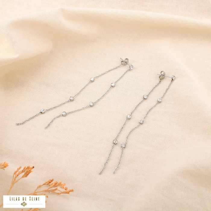 Leur silhouette filante (3x90 mm) est rythmée de petits strass délicatement sertis sur une double chaîne. Disponibles en doré et argenté, elles apportent une touche de lumière à toutes les tenues, du quotidien aux grandes occasions.