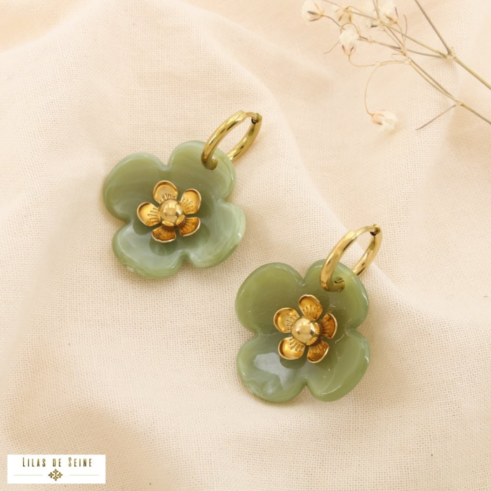 Chaque créole arbore un pendentif en forme de fleur aux finitions soignées et lumineuses, disponible en plusieurs nuances subtiles (ambre, ivoire, vert amande, bleu pastel, rose poudré). La dimension de l’ensemble est d’environ 27x36 mm, une taille idéale pour habiller le visage tout en conservant une allure légère et féminine.