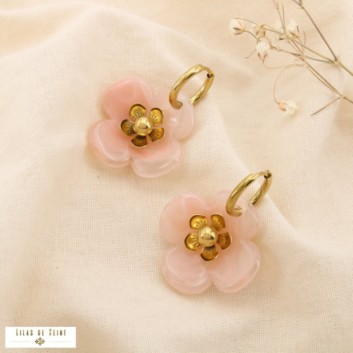 Chaque créole arbore un pendentif en forme de fleur aux finitions soignées et lumineuses, disponible en plusieurs nuances subtiles (ambre, ivoire, vert amande, bleu pastel, rose poudré). La dimension de l’ensemble est d’environ 27x36 mm, une taille idéale pour habiller le visage tout en conservant une allure légère et féminine.