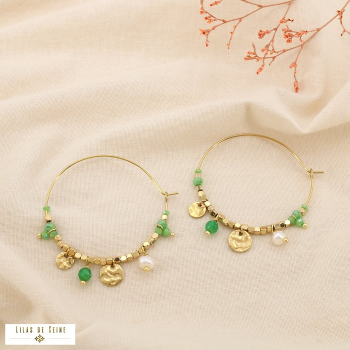 Créoles acier bohème pampille cristal perle pierre 0325202 vert