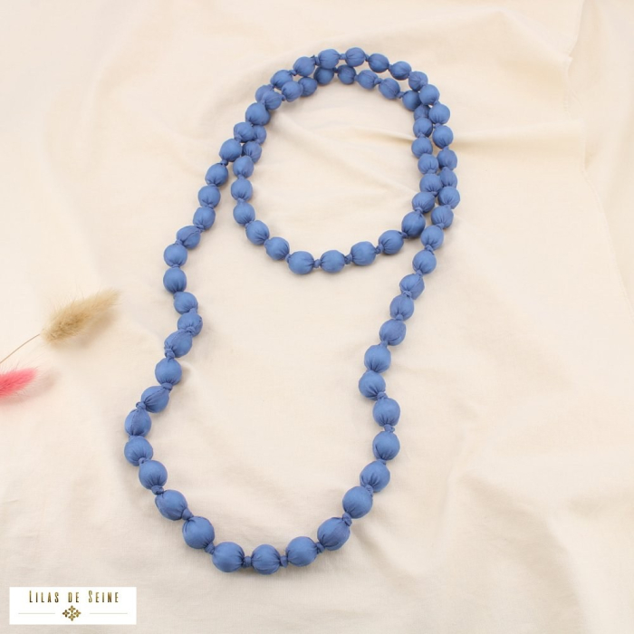 Ce collier sautoir en acrylique, entièrement habillé de tissu polyester, séduit par son design moderne et sa grande longueur. Chaque boule d’environ 13 mm est enveloppée de tissu, créant un effet original et élégant. Avec sa longueur déployée de 150 cm, ce bijou peut être porté de multiples façons : en simple rang pour un look épuré ou en double tour pour un style plus affirmé.