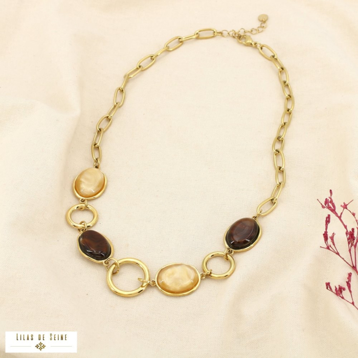 Découvrez ce collier en acier inoxydable et résine, pensé pour sublimer les collections des revendeurs professionnels, boutiques de mode et concept-stores à la recherche de pièces originales et raffinées. Avec sa longueur déployée d’environ 42,5 cm, ce bijou associe des maillons rectangulaires à des anneaux ronds et des cabochons en résine colorée, offrant un équilibre parfait entre modernité et élégance. La fermeture mousqueton et la chaînette d’extension de 5 cm permettent un ajustement confortable et pratique.