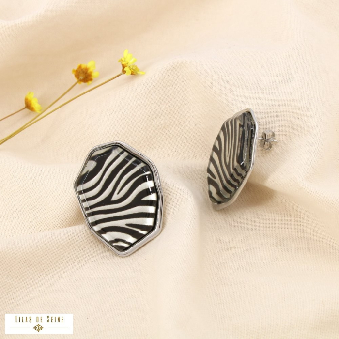 Apportez une touche sauvage et élégante à votre sélection avec ces boucles d’oreilles en acier inoxydable (réf 0325503), sublimées par un cabochon en résine au motif zèbre. Conçues pour les oreilles percées, elles se fixent facilement grâce à un fermoir papillon. Avec leurs dimensions de L25 x H32 mm environ, elles offrent une présence affirmée tout en restant confortables à porter. Disponibles en deux déclinaisons chic : noir/argenté et marron/doré.