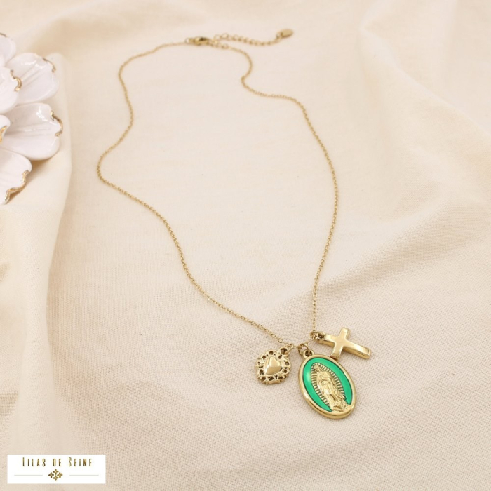Découvrez ce collier en acier inoxydable raffiné, pensé pour les revendeurs professionnels, les boutiques de prêt-à-porter, bijouteries, concept-stores, instituts de beauté et salons de coiffure à la recherche de pièces tendances et symboliques. Ce bijou combine spiritualité et élégance avec ses charms emblématiques.