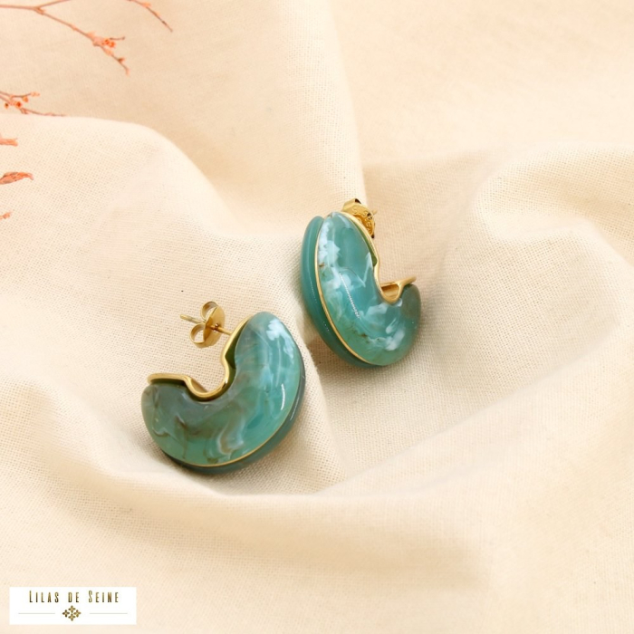 Ces boucles d’oreilles en acier inoxydable et résine séduisent par leur design moderne et audacieux. Avec un diamètre d’environ 25 mm, elles allient la brillance dorée de l’acier à l’éclat nuancé de la résine colorée, disponible en plusieurs teintes dont le vert et le mauve. La couleur marbrée varie suivant chaque bijou. Leur forme créole revisitée en fait un accessoire raffiné et tendance, facile à intégrer à toute garde-robe.