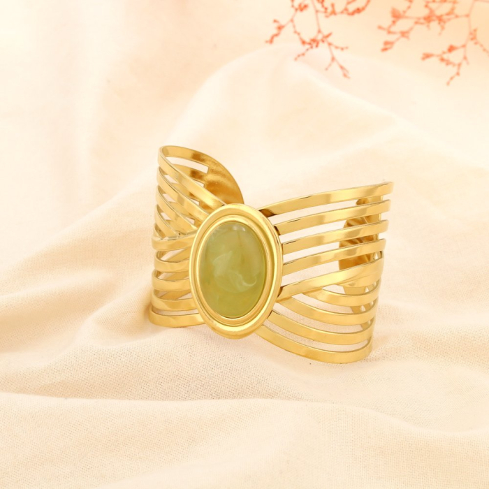 Ce bracelet manchette associe la brillance de l’acier inoxydable doré à l’élégance d’une pierre en résine, créant un contraste moderne et sophistiqué. Sa largeur généreuse en fait un bijou statement qui attire le regard tout en restant facile à porter au quotidien comme lors d’occasions spéciales.
