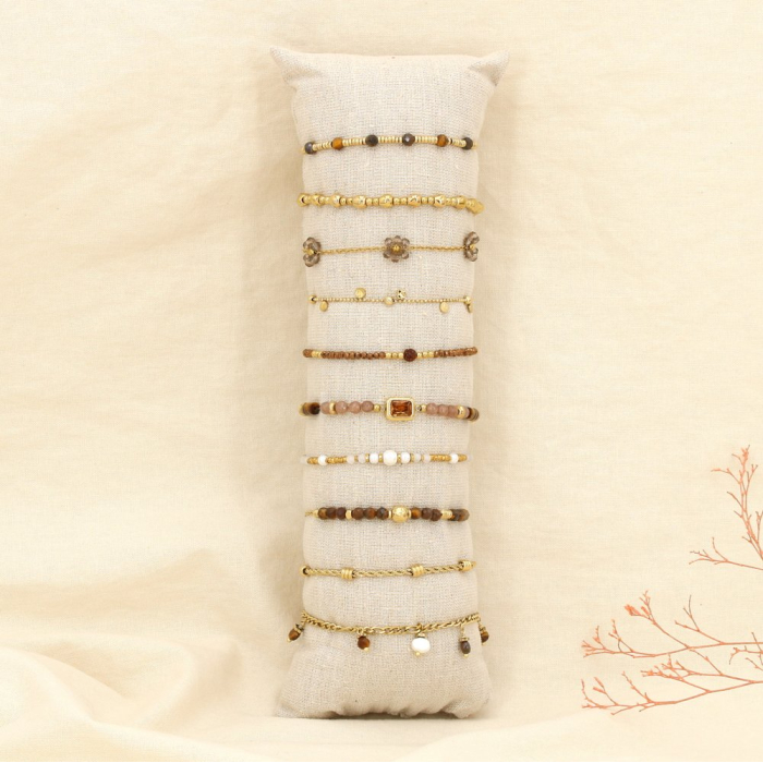 Présentés sur un boudin en tissu scintillant, ces bracelets offrent une harmonie de tons dorés et bruns, parfaits pour la saison. Cet assortiment prêt-à-vendre est idéal pour les professionnels recherchant une présentation soignée et immédiatement exploitable en boutique.