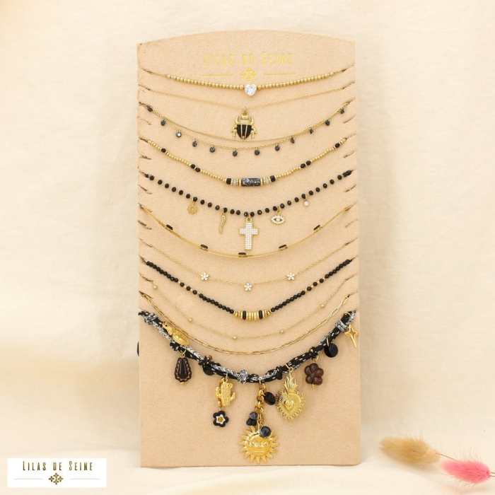 Ce présentoir de 10 colliers en acier inoxydable incarne un style audacieux et raffiné, idéal pour sublimer toutes les vitrines de bijouterie. Les créations associent avec élégance émail coloré, perles acryliques, strass scintillants, pierres, verre et cristal. Les nuances dorées et noires s’équilibrent parfaitement pour offrir un rendu à la fois sophistiqué et contemporain. Les pendentifs symboliques – croix, soleil, cœur sacré, scarabée ou lune – ajoutent une dimension mystique et précieuse à l’ensemble.