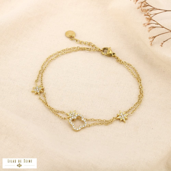 Ce bracelet en acier inoxydable se distingue par ses pendentifs étoile et trèfle délicatement sertis de strass, offrant une touche lumineuse et raffinée au poignet. Disponible en doré et argenté, il répond parfaitement aux attentes des professionnels recherchant un bijou tendance, élégant et facile à assortir.