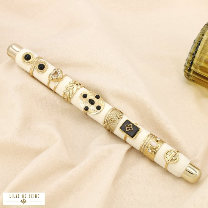 Découvrez cet ensemble raffiné de 8 bagues en acier inoxydable, sublimées par des strass étincelants et des pierres décoratives noires, idéal pour enrichir votre sélection en boutique. Présentées sur un support élégant, ces bagues offrent une harmonie parfaite entre modernité, design sculptural et détails précieux.