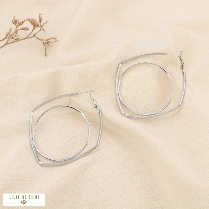 Ces boucles d’oreilles géométriques en acier inoxydable offrent une allure contemporaine et élégante, idéale pour enrichir une sélection professionnelle en boutique. Leur structure à double forme — un cercle intérieur suspendu dans un cadre carré légèrement arrondi — crée un volume graphique subtil et moderne. Disponibles en doré et argenté, elles s’adaptent parfaitement aux collections tendance et minimalistes.