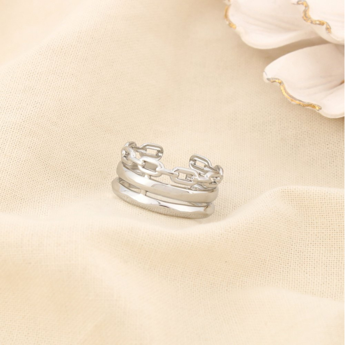 Cette bague ouverte en acier inoxydable se distingue par son design structuré mêlant anneaux lisses et motif chaîne. Pensée pour une clientèle professionnelle, elle répond aux attentes actuelles en matière de bijoux graphiques, durables et faciles à porter au quotidien.