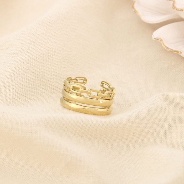 Cette bague ouverte en acier inoxydable se distingue par son design structuré mêlant anneaux lisses et motif chaîne. Pensée pour une clientèle professionnelle, elle répond aux attentes actuelles en matière de bijoux graphiques, durables et faciles à porter au quotidien.