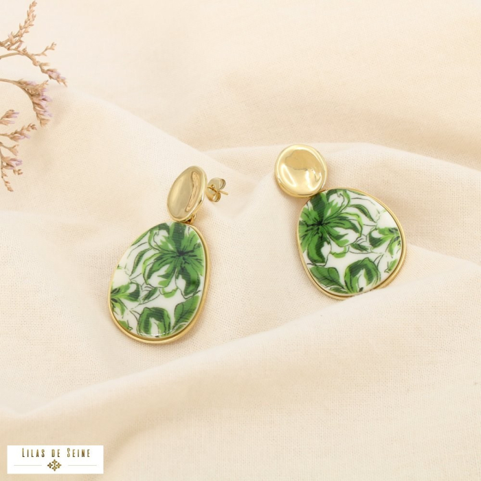 La partie supérieure en acier finition dorée apporte une touche lumineuse et structurée, tandis que le pendentif en acrylique imprimé offre un jeu de couleurs harmonieux et raffiné. Leur format équilibré assure une belle présence à l’oreille tout en conservant un confort optimal au porté.