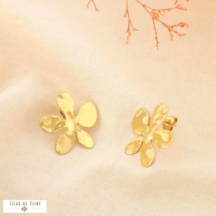Ces puces d’oreilles à fleur stylisée en acier inoxydable offrent un design à la fois féminin, graphique et résolument tendance. Leur forme florale abstraite, aux lignes douces et légèrement martelées, apporte du caractère tout en conservant une élégance facile à porter au quotidien.