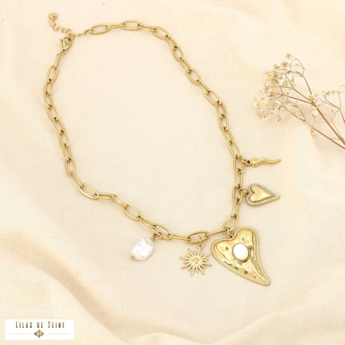 Ce collier à charms en acier inoxydable incarne parfaitement l’esprit bijou mode et tendance. Sa chaîne à gros maillons ovales apporte un caractère affirmé, tandis que l’association de charms stylisés crée un bijou à la fois symbolique, féminin et résolument contemporain. Chaque pendentif – cœur texturé, soleil rayonnant, piment porte-bonheur et perle d’eau douce – compose un ensemble harmonieux et visuellement attractif.