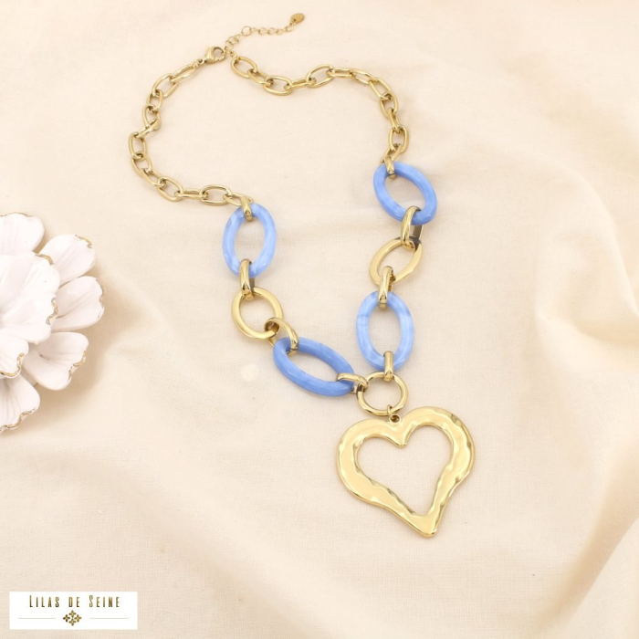 La structure alterne une chaîne à maille ovale en acier inoxydable et des anneaux en résine colorée, créant un contraste harmonieux entre brillance métallique et douceur de la couleur. L’ensemble est sublimé par un pendentif cœur stylisé à la finition légèrement martelée, apportant caractère et modernité à ce bijou statement.