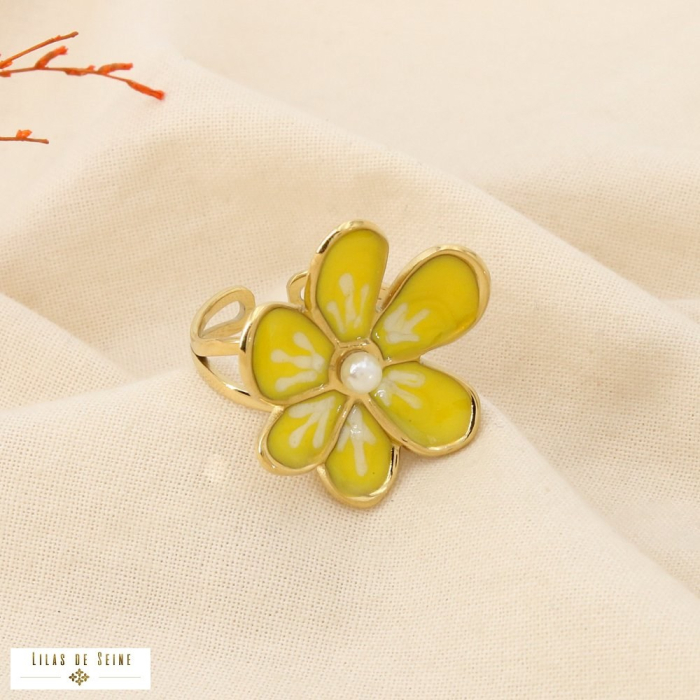 La pièce centrale met en valeur une fleur en émail aux pétales finement travaillés, soulignés par une structure en acier inoxydable à la finition dorée. Le cœur de la fleur est sublimé par une perle nacrée en acrylique, apportant une touche lumineuse et élégante à l’ensemble. La structure double anneaux ouverte renforce l’esthétique moderne du bijou tout en assurant un port confortable.