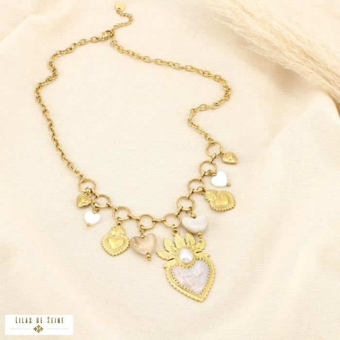Ce collier en acier inoxydable se distingue par un design riche et symbolique, mêlant avec élégance émail, résine, nacre et perle acrylique. Inspiré de l’univers du cœur sacré, il associe un pendentif central travaillé à une composition de breloques décoratives en forme de cœurs, pour un rendu à la fois expressif et raffiné.