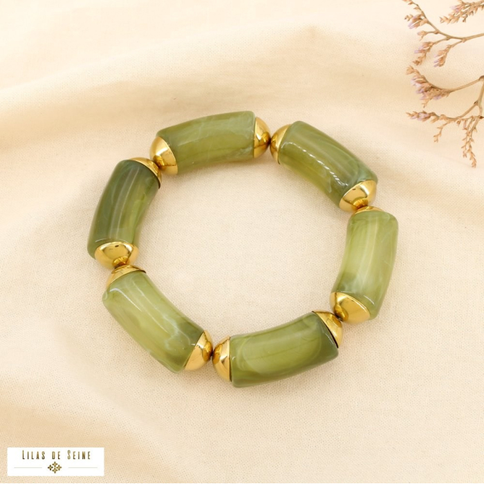 Le bracelet est composé de tubes en résine marbrée, aux nuances subtiles et élégantes, associés à des capuchons en acier inoxydable à la finition brillante. Ce contraste de matières apporte du relief et une touche moderne, tout en conservant une allure harmonieuse et féminine.