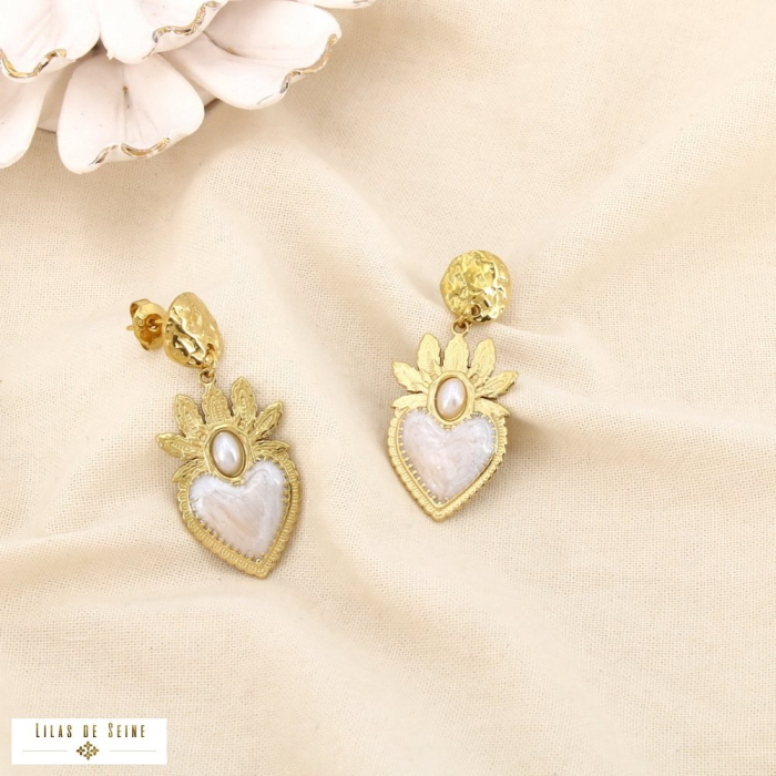 Le design se compose d’une puce martelée au fini texturé, prolongée par un pendentif cœur émaillé orné de détails dorés et surmonté d’une perle acrylique effet nacré. Cette combinaison de matières et de reliefs confère aux boucles d’oreilles une belle profondeur visuelle tout en conservant une silhouette équilibrée.