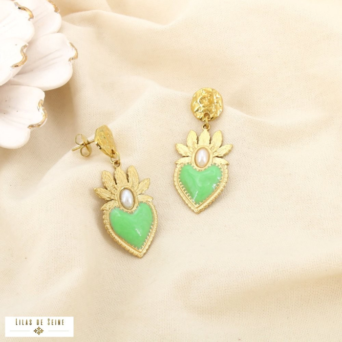 Ces boucles d’oreilles en acier inoxydable s’inspirent de l’iconographie du cœur sacré pour proposer un bijou à forte identité visuelle, à la fois décoratif et raffiné. Elles associent avec harmonie acier doré, émail coloré et perle acrylique, offrant un rendu élégant et soigneusement travaillé, parfaitement adapté aux tendances actuelles.
