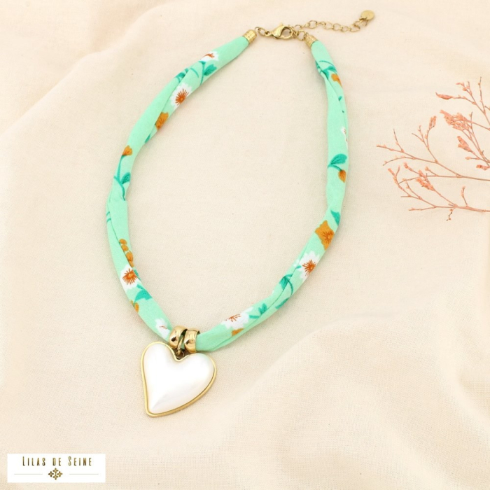 Le contraste entre le lien textile imprimé et le pendentif coeur épuré apporte une touche de modernité et de légèreté. Ce collier s’inscrit parfaitement dans les tendances actuelles mêlant matières textiles et détails métalliques, pour un rendu à la fois casual et soigné.