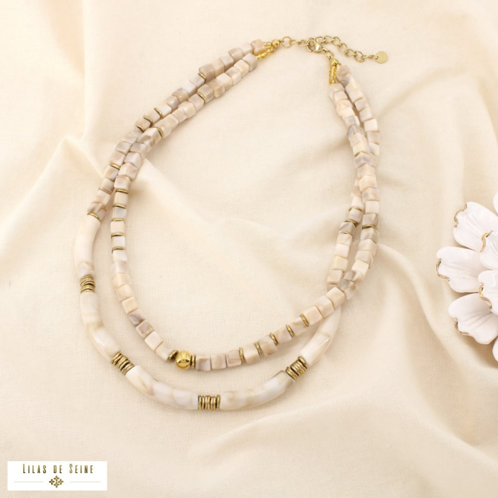 Composé de cubes et de tubes en résine marbrée, associés à des billes et intercalaires en acier inoxydable, ce collier offre un équilibre harmonieux entre matières, formes géométriques et finitions soignées. Le jeu de volumes et de transparence de la résine apporte luminosité et relief, tandis que l’acier garantit durabilité et qualité de tenue dans le temps.