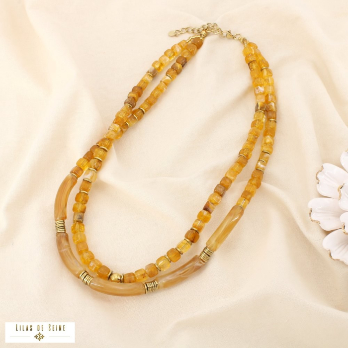 Composé de cubes et de tubes en résine marbrée, associés à des billes et intercalaires en acier inoxydable, ce collier offre un équilibre harmonieux entre matières, formes géométriques et finitions soignées. Le jeu de volumes et de transparence de la résine apporte luminosité et relief, tandis que l’acier garantit durabilité et qualité de tenue dans le temps.