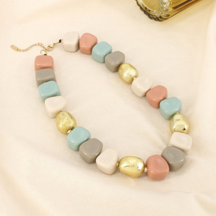 Les perles adoptent une forme de cube légèrement arrondie, offrant un rendu moderne et harmonieux. La palette de couleurs, mêlant des tons doux et tendance tels que le rose poudré, le vert d’eau, le blanc cassé et le gris, est ponctuée d’éléments dorés texturés qui apportent lumière et relief à l’ensemble.