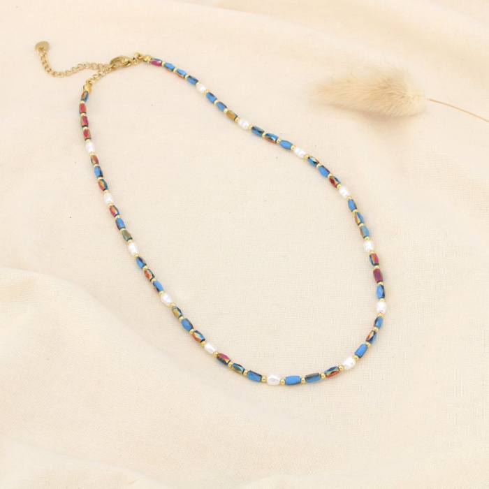 Ce collier en acier inoxydable séduit par son design délicat et lumineux, associant des cristaux facettés de 3 mm à des perles acryliques blanches, subtilement rythmés par des intercalaires dorés. Pensé pour répondre aux attentes des revendeurs professionnels, il s’inscrit parfaitement dans les tendances actuelles de bijoux fins, colorés et faciles à porter au quotidien.