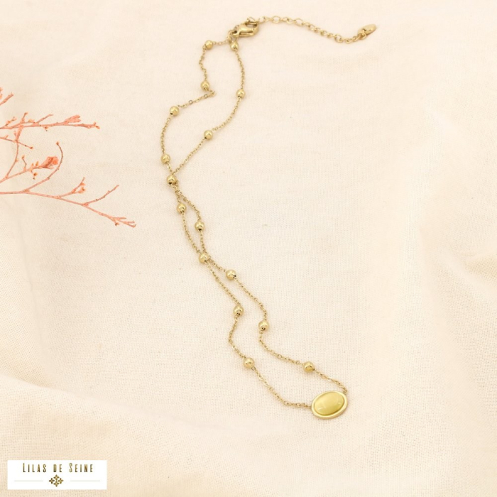 Collier acier inoxydable billes verre cabochon ovale 0126090 jaune