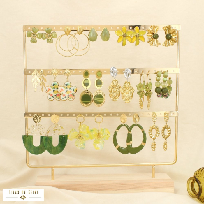 Conçu pour répondre aux exigences des professionnels de la mode et de la beauté, cet ensemble de 15 paires de boucles d’oreilles est une solution clé en main idéale pour dynamiser un espace de vente. Il associe des boucles d’oreilles en acier inoxydable, résine et émail à un présentoir élégant en métal doré et bois naturel, pensé pour une mise en avant immédiate en boutique.