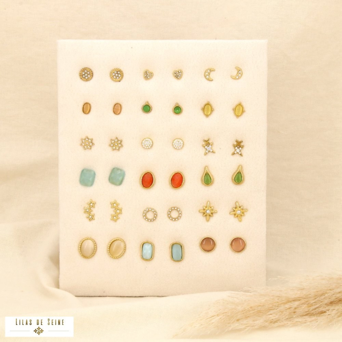 Ce lot comprend 18 paires de puces d’oreilles aux designs variés : motifs solaires, cœurs, lunes, étoiles, formes ovales et géométriques, cabochons colorés et détails sertis de strass. L’alternance de finitions dorées et de teintes lumineuses (vert, corail, bleu, nude…) apporte profondeur et diversité à votre offre.