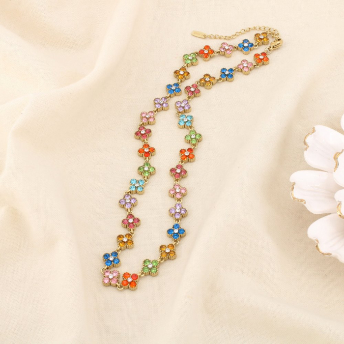 Le collier est rythmé par des motifs trèfle d’environ 8 x 8 mm, délicatement sertis de strass. Chaque élément crée un jeu de lumière subtil, offrant un rendu à la fois raffiné et tendance. La répétition régulière des trèfles structure le bijou et lui confère une identité forte, adaptée aussi bien à un positionnement chic qu’à une offre fantaisie premium.