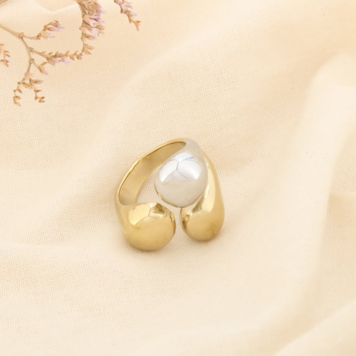 Cette bague en acier inoxydable se distingue par sa construction ouverte et ses formes généreuses. Le contraste entre les deux teintes métalliques apporte relief et modernité, tout en facilitant l’association avec d’autres bijoux dorés ou argentés.